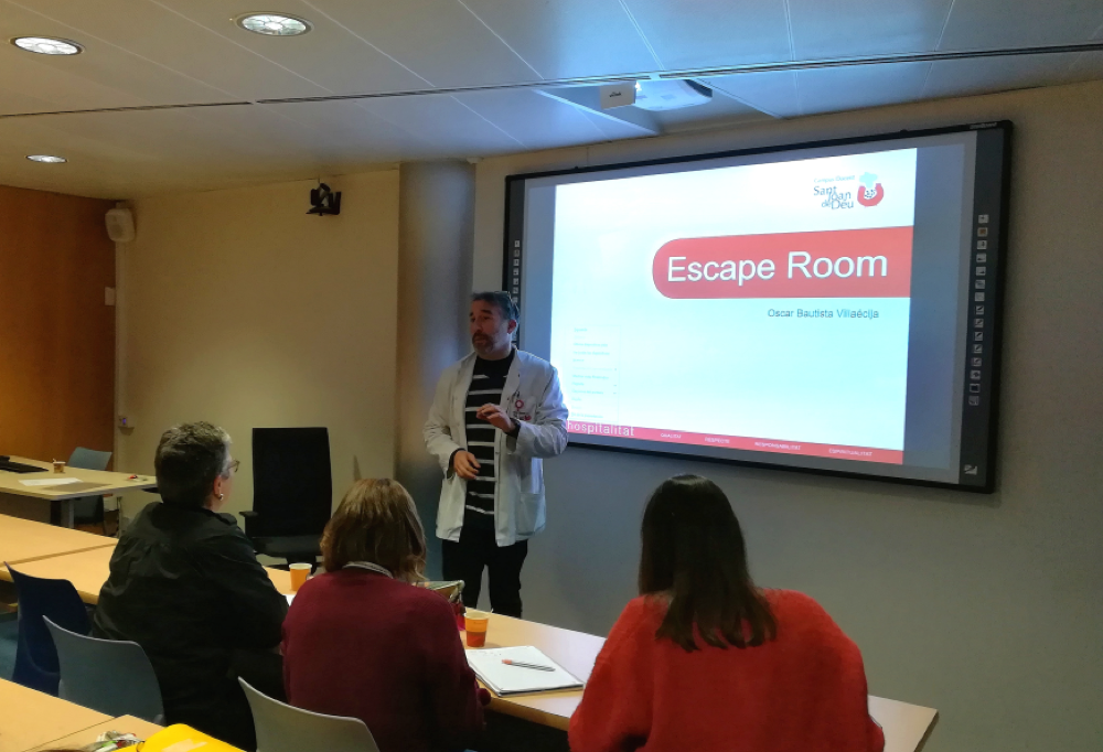 El Sr. Óscar Bautista va explicar el procés seguit i l’experiència d’implementació d’Escape Rooms a l’assignatura d’Infermeria Clínica I amb l’objectiu de refermar els coneixements impartits a l’aula. El docent va remarcar la necessitat d’elaborar continguts motivadors que enganxin a l’estudiant en l’aprenentatge.