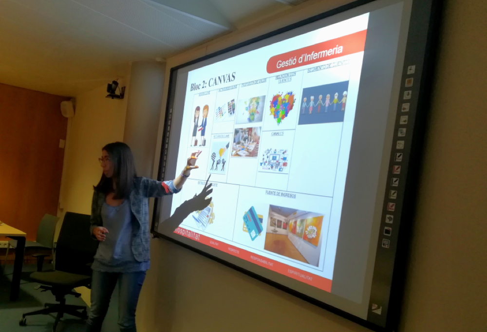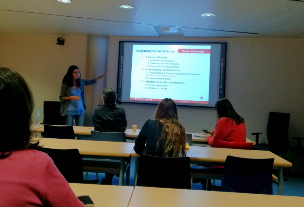 En nom de la Dra. Guilera i la Dra. Júlia Roura, la Sra. Ariadna Graells va exposar els canvis realitzats pel que fa a continguts i avaluació dins l’assignatura de Gestió d’Infermeria. L’ús d’eines digitals cooperatives per part dels estudiants, la ideació d’una empresa per a resoldre un repte social actual, la presentació d’aquesta a la resta de companys mitjançant l’ús del CANVAS i l’avaluació a través de rúbriques d’avaluació individuals i de grup han estat algunes de les estratègies i recursos utilitzats pels docents per a transmetre la importància de l’emprenedoria i el management en Infermeria.