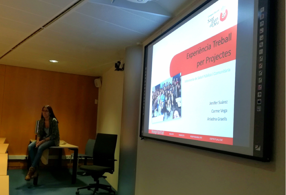 La Sra. Ariadna Graells, en nom de l’equip de treball que lidera l’assignatura de Salut Pública i que està constituit per la Sra. Carme Vega, la Sra. Jennifer Suárez i ella mateixa, va compartir l’Experiència d’aplicació de la metodologia de Treball per Projectes tot buscant que els estudiants elaboressin propostes de salut que tinguessin en compte, no només la casuística de la malaltia, sinó també el context on aquesta es dóna. El barri del Carmel amb les seves característiques urbanístiques, demogràfiques i socioeconòmiques va ser el barri on els estudiants van poder observar, experimentar i compartir amb la comunitat les principals problemàtiques que després van ser treballades a l’aula.