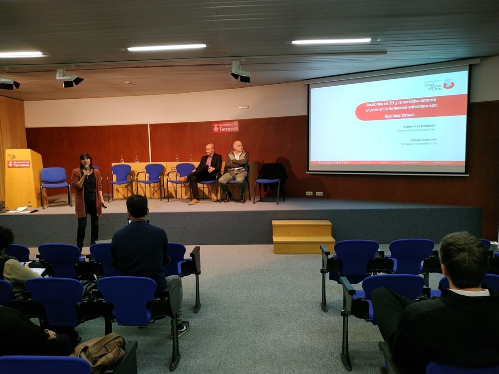 Els dies 21 i 22 de novembre es va celebrar el II Serious Game Camp (#sgc2019), un programa de sensibilització, formació i creació de noves empreses orientades al desenvolupament de serious games amb tecnologies de realitat virtual i realitat augmentada, enfocats a les àrees d’educació, formació i salut. En aquest espai híbrid van confluir, compartir experiències i treballar plegats professionals de diferents disciplines (salut i tecnologia) i àmbits amb un mateix objectiu: aprendre compartint per proporcionar millors solucions als problemes de l’àmbit de la salut. El primer dia van tenir lloc una diversitat de ponències entre les que consta la presentada per la nostra professora Esther Insa qui va presentar el projecte VR4Health (CDSJD i UPC) amb la comunicació titulada: “Anatomía en 3D y la narrativa entorno al valor en la formación enfermera con Realidad Virtual”. La ponent va fer èmfasi en dos aspectes: el primer sobre l’efectivitat de l’ús de la Realitat Virtual (RV) per l’aprenentatge d’aquells aspectes de l’anatomia i fisiologia humana que no es poden treballar a l’aula, com és la comprensió del volum i la relació espacial que guarden les estructures internes i que la RV ha de ser tractada com una eina complementària en l’aprenentatge i no substitutiva d’altres eines o mètodes d’aprenentatge. El segon aspecte és la importància de la participació de l’usuari des del primer moment en el disseny d’experiències de RV per tal d’assegurar l’èxit del projecte. Però què aporta i quin és el valor de la RV per a infermeria? A través de l’experiència d’implementació del projecteVR4Health al llarg de 5 anys, la ponent va identificar tres qualitats fonamentals que infermeria aporta als projectes: el coneixement de l’usuari, la competència per a dissenyar experiències d’aprenentatge i l’aptitud per a identificar i fer visibles els components essencials de la cura. En el darrer punt va ressaltar, per una banda, els aspectes relacionals tals com la presència, la confiança, l’empatia, la compassió, l’ajuda i altruisme, l’emoció i la participació, i per l’altra, els valors, destacant especialment la responsabilitat, el respecte i la qualitat. El Campus Docent agraeix la invitació a la jornada i poder seguir aprenent en l’àmbit de les tecnologies aplicades a la salut i l’educació.